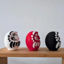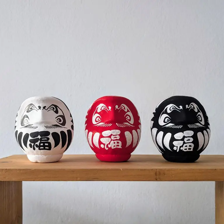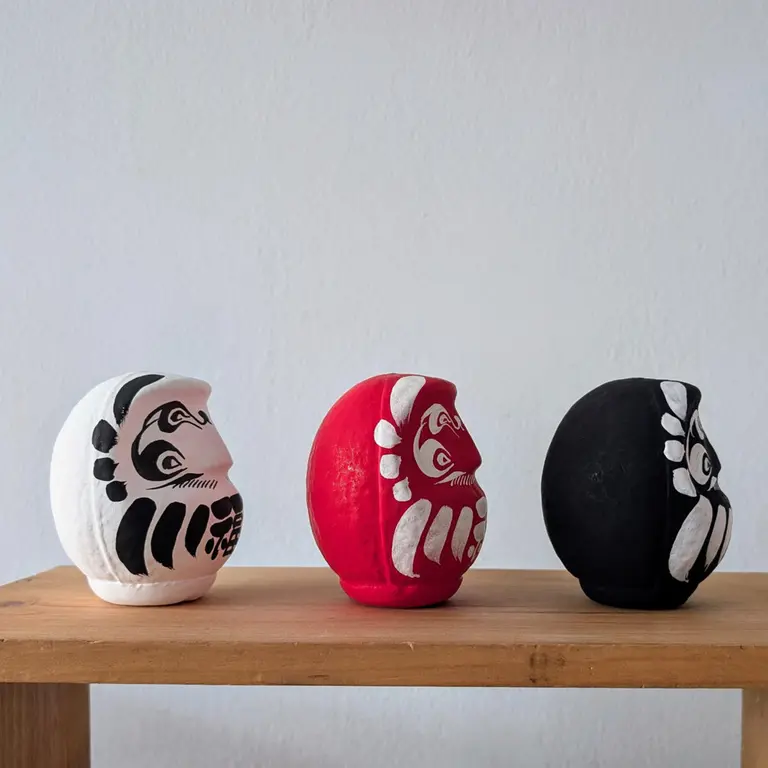 Figura Daruma tradicional japonesa elaborada de forma 100% artesanal. Cada pieza está completamente pintada a mano, por lo que no existen dos iguales. Es un símbolo de constancia, protección y cumplimiento de objetivos en la cultura japonesa.