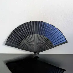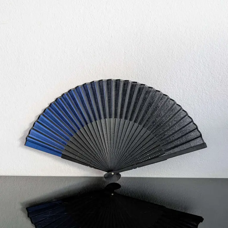 Es un abanico japonés vintage, una pieza única e irrepetible. Presenta un bonito degradado en tonos de azul y negro.