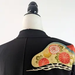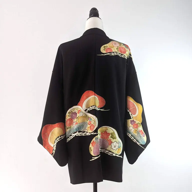 Se trata de un elegante haori negro adornado con hermosos diseños de crisantemos y ginkgo biloba, que le confieren un toque de color y distinción.
