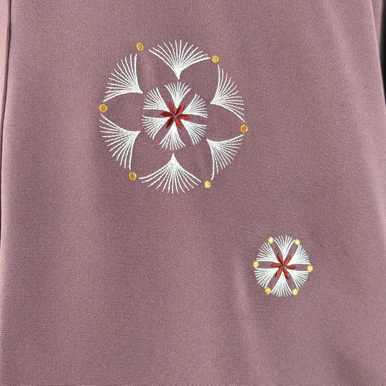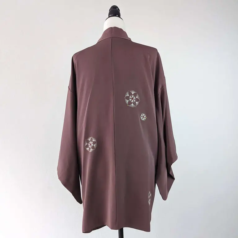 El haori vintage de color lila añade un toque formal y elegante. Está adornado con bordados de flores.