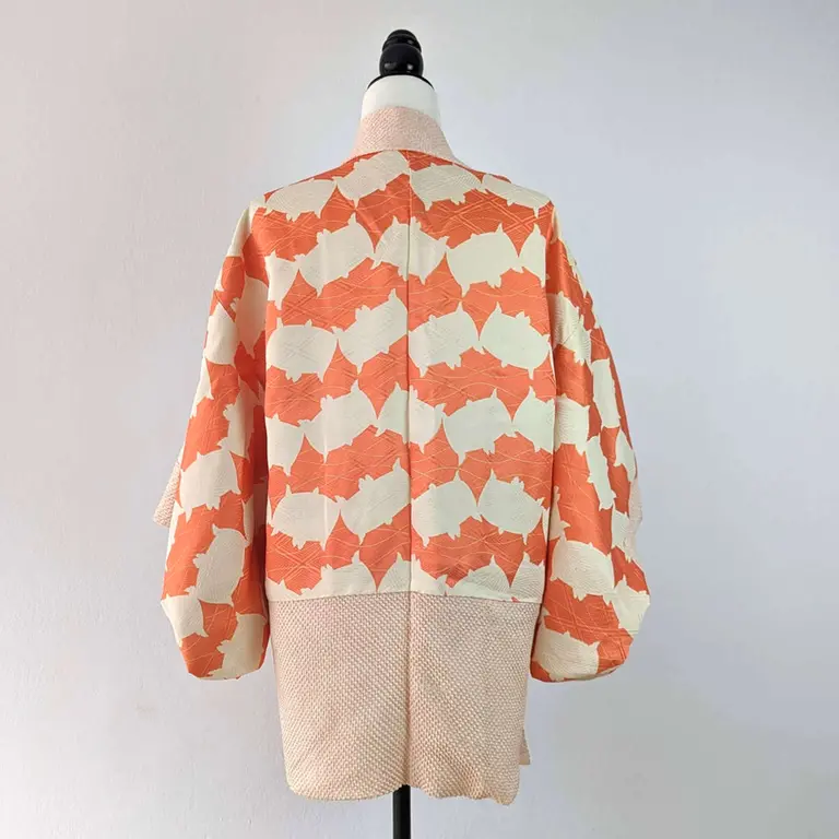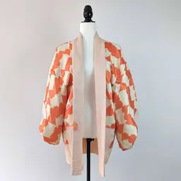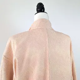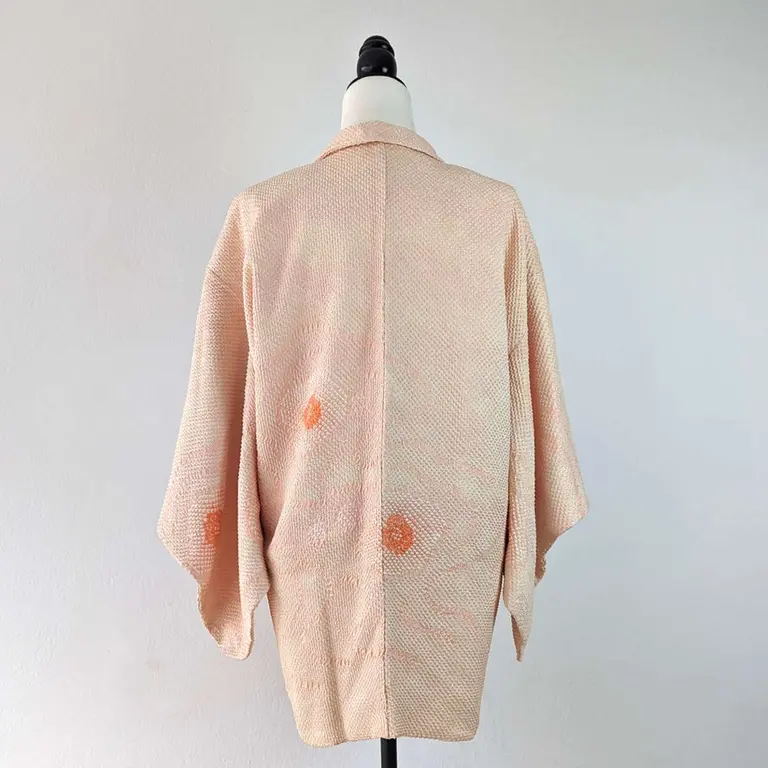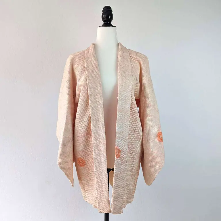 Un haori vintage de color rosa confeccionado utilizando la técnica manual japonesa de teñido por reserva llamada shibori. Esta técnica crea hermosos patrones en las telas.