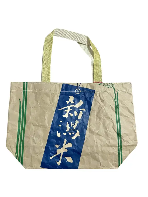 Esta bolsa tipo tote está confeccionada a partir de sacos de arroz reciclados. Hecha de papel resistente, combina ligereza y durabilidad, permitiendo transportar objetos pesados con facilidad. Su diseño sostenible y único la convierte en una opción práctica y ecológica para el día a día.