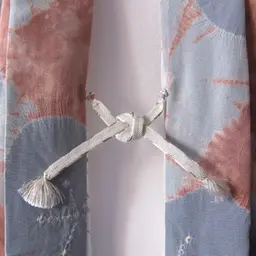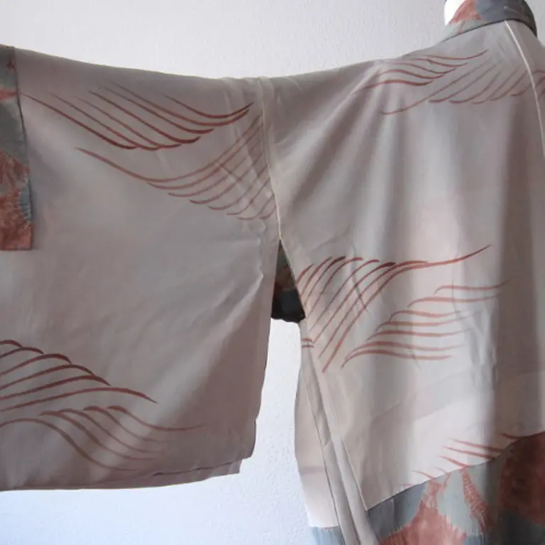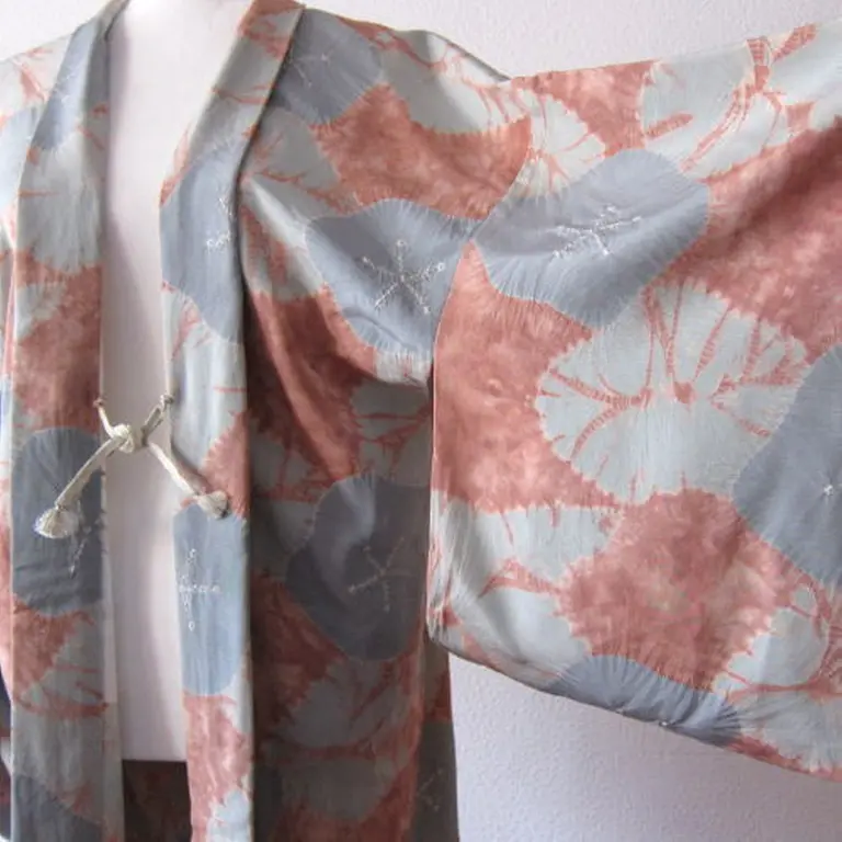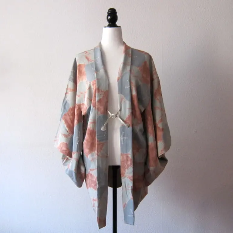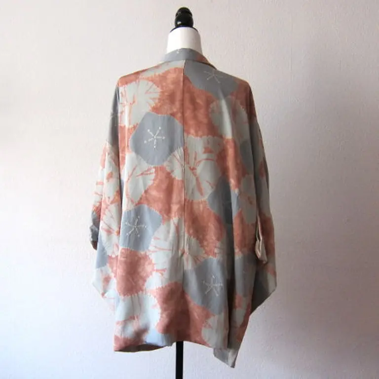 Haori vintage con estampado de las flores de camellia japónica confeccionado al estilo shibori. Shibori es una técnica manual japonesa de teñido por reserva que produce patrones en las telas. La combinación de color azul-gris y rosado es excepcional.