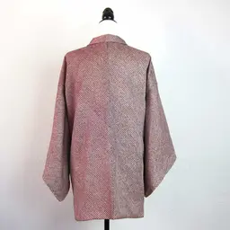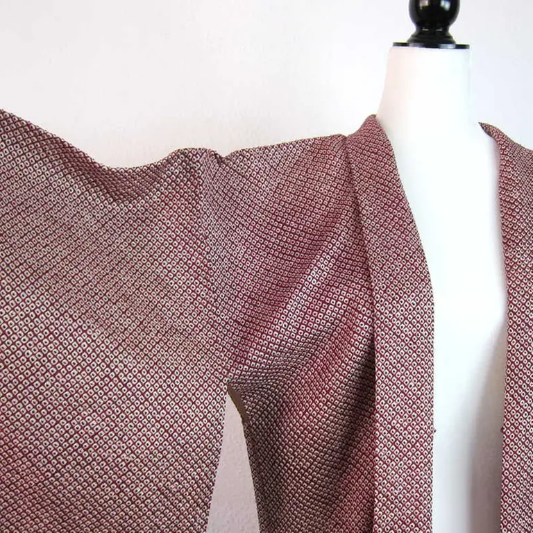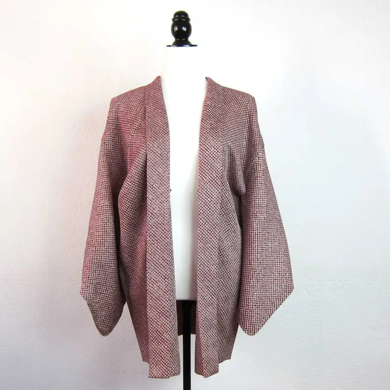 Haori vintage de color rojo confeccionado al estilo shibori. Shibori es una técnica manual japonesa de teñido por reserva que produce patrones en las telas.