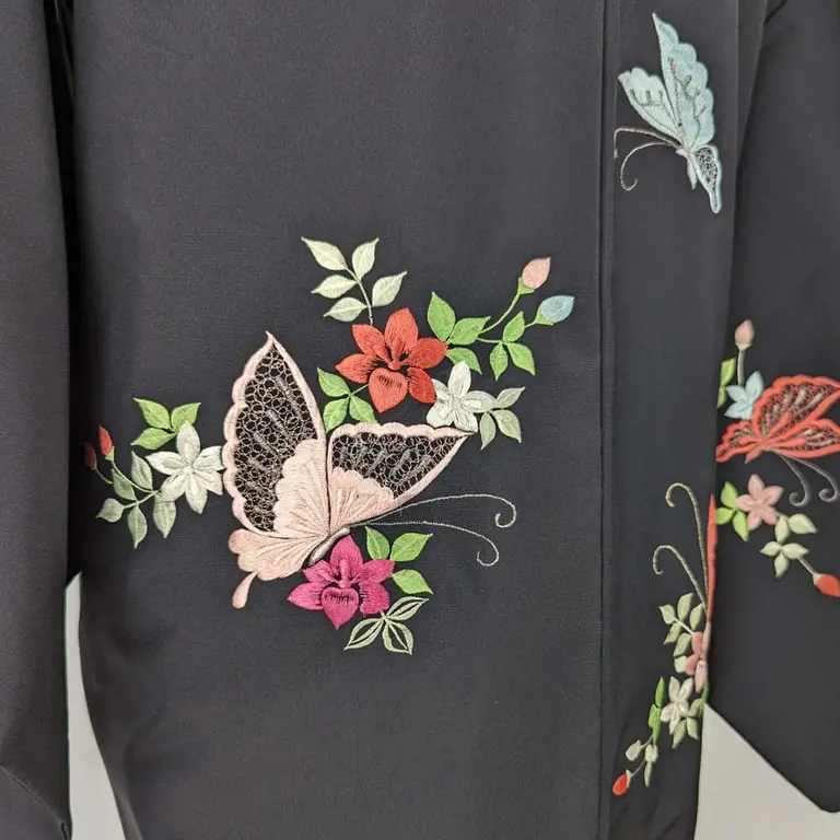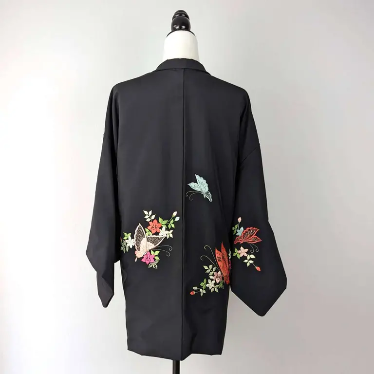 Haori vintage de color negro que da un toque formal y elegante. Tiene dibujo de las mariposas.