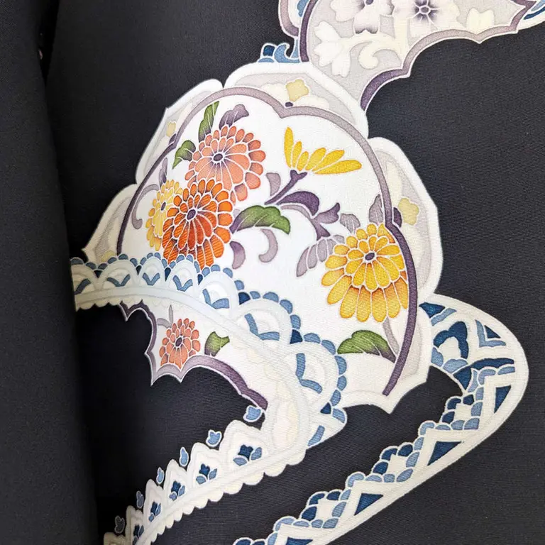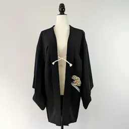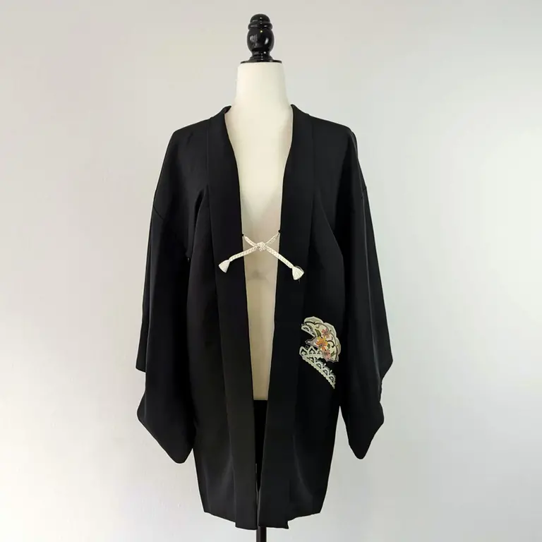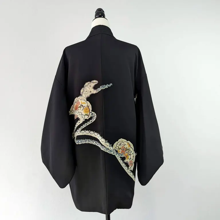 Haori vintage de color negro que da un toque formal y elegante. Tiene dibujo de los crisantemos.
